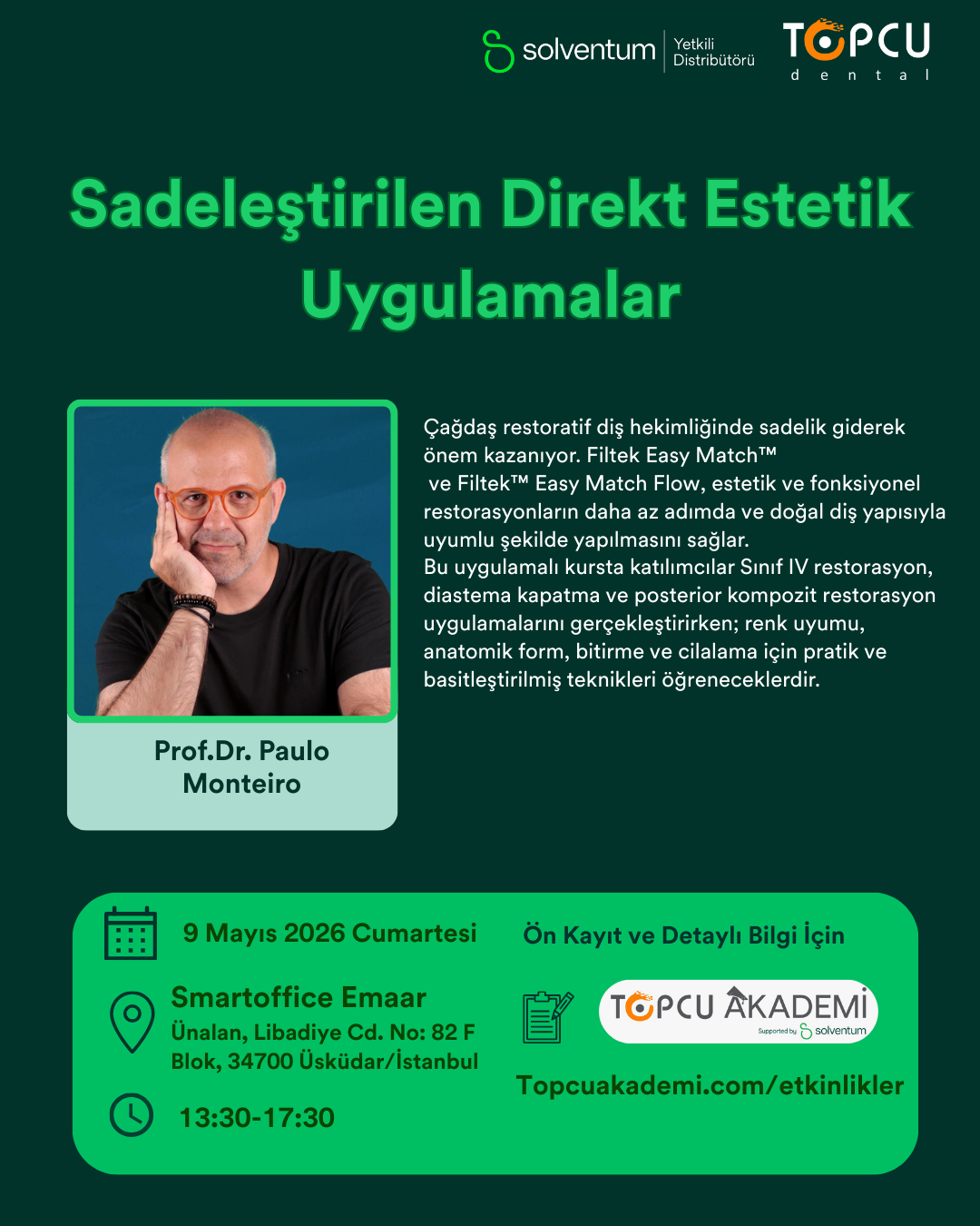 Bu uygulamalı kurs sırasında katılımcılar, Sınıf IV restorasyonları, diastema kapatma ve posterior kompozit restorasyonları gerçekleştirecek ve renk uyumu, anatomik rekonstrüksiyon, bitirme ve cilalama için basitleştirilmiş teknikleri öğreneceklerdir. Bu oturum, klinisyenlerin günlük uygulamalarında iş akışını optimize ederken öngörülebilir estetik sonuçlar elde etmelerine yardımcı olmak için tasarlanmış pratik klinik bilgiler ve verimli protokoller sunacaktır.